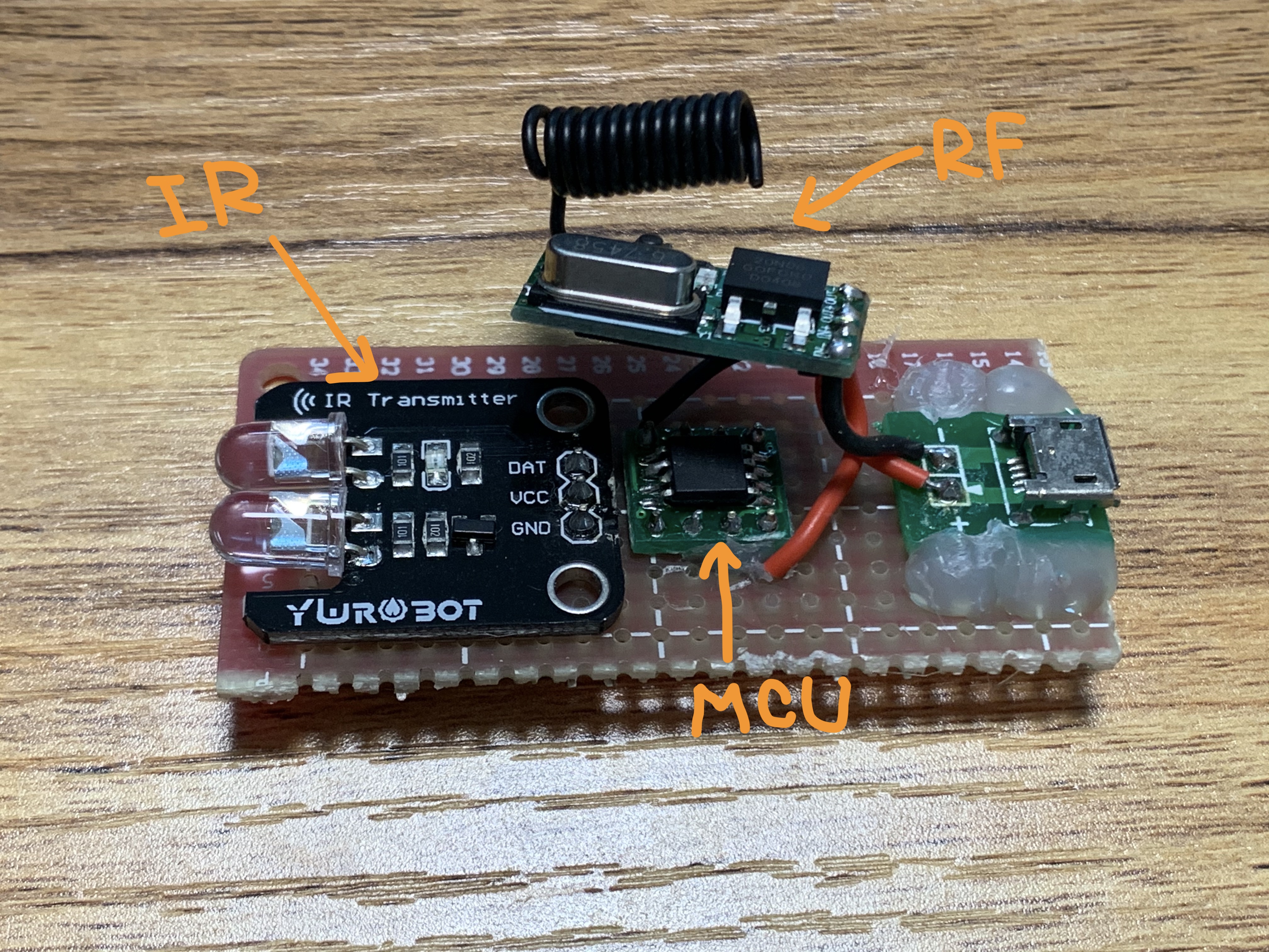 MCU에 프로그래밍된 펌웨어에 따라서 특정 적외선 리모콘 신호를 IR Transmitter 모듈을 통해 전송한다.